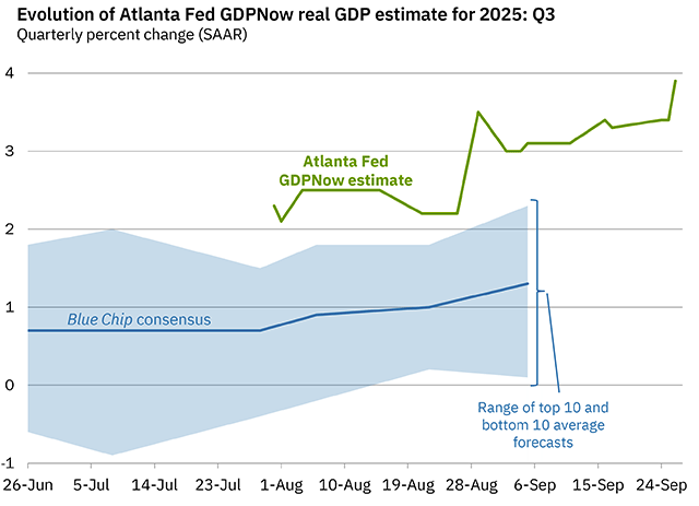 Environnement économique et résultats des sociétés. En dépit d’un marché de l’emploi en ralentissement, l’un des indicateurs les plus fiables pour suivre la conjoncture américaine, le « GDP Now » de la Fed d’Atlanta, confirme la solidité de l’économie américaine : l’économie serait ainsi en progression de près de 4% au cours du trimestre écoulé, succédant à une croissance de 3,9% au 2ème trimestre qui rattrapait elle-même le faible 0,6% du premier trimestre : c’est le recul des importations et la reprise de la consommation qui portent l’essentiel de cette performance. Et les messages qui remontent des chefs d’entreprises confirment ces prévisions : au cours des conférences données lors des publications de résultats, le mot « récession » a été cité moins de 300 fois, contre 800 occurrences au T1, revenant vers les plus bas historiques. Cela dépend des secteurs mais même sur la consommation donc, les prévisions ne sont pas si mauvaises : les entreprises concernées signalent que les clients sont « résilients mais prudents, à la recherche de valeur, et sélectifs ». En synthèse et en dépit du ralentissement de l’emploi et d’un consensus assez pessimiste sur les perspectives d’activité au deuxième semestre (croissance attendue vers 1-1,5%), il n’y a pour le moment pas de signaux tangibles d’un ralentissement marqué de l’économie tant de la part des entreprises que sur la base des données macro disponibles.