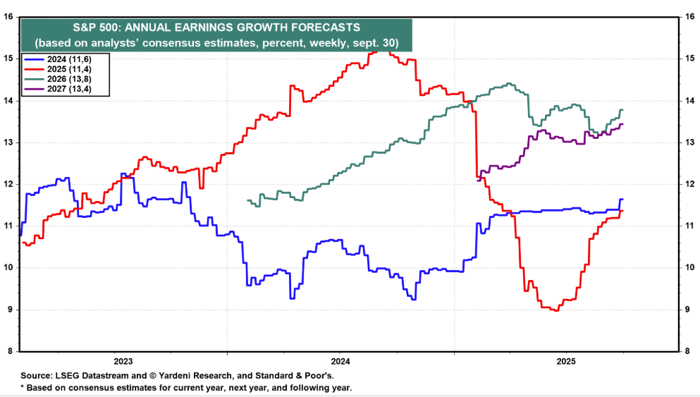 On comprend mieux dans ces conditions que les résultats des sociétés américaines du 2ème trimestre aient une nouvelle fois surpris à la hausse, progressant de 12% en glissement annuel, soit 8 points de plus que ce qui était attendu au 30 juin. Hors secteur de l’énergie la croissance des bénéfices s'établit même à +14% sur un an. Et de l'autre côté, la technologie, les services de communication / internet et les services financiers enregistrent une forte croissance (15 à 20%) de leurs bénéfices. L’ensemble des prévisions de résultats a donc été logiquement soit revu à la hausse pour cette année (de 9 à 12%) mais également pour 2026 (de 13 à 14%) et même 2027 au sujet de laquelle les prévisions commencent à sortir, du fait des éléments macro évoqués ci-dessus mais également de la capacité des entreprises à surmonter les vents contraires actuels :