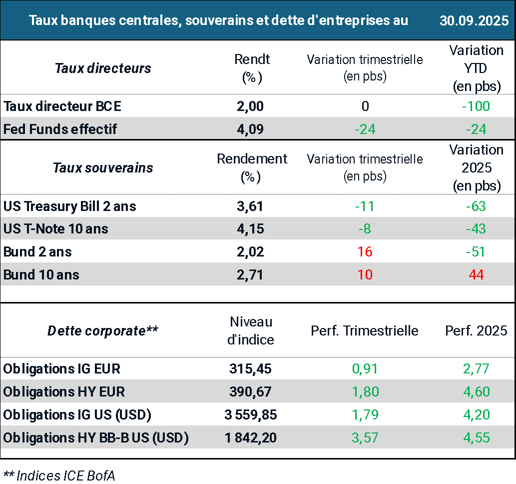 - L’inflation s’est stabilisée à 3,1% sur un an et les prix à la production, ont reculé, confirmant que les droits de douane n’ont pour le moment pas de nouveau impact sur le niveau des prix américains. Il est vraisemblable que les chiffres de fin d’année seront moins favorables mais cela montre que pour le moment les 3,8 / 4,0% de croissance des 2ème et 3ème trimestres ne génèrent pas d’inflation supplémentaire. Cette situation permet de faire revenir les anticipations d’inflation vers 3% alors qu’elles se situaient autour de 5% en début d’année, et valide l’analyse de la Fed selon laquelle si une « tariff inflation » devait survenir, elle serait très probablement temporaire. Double réconfort pour elle donc ;